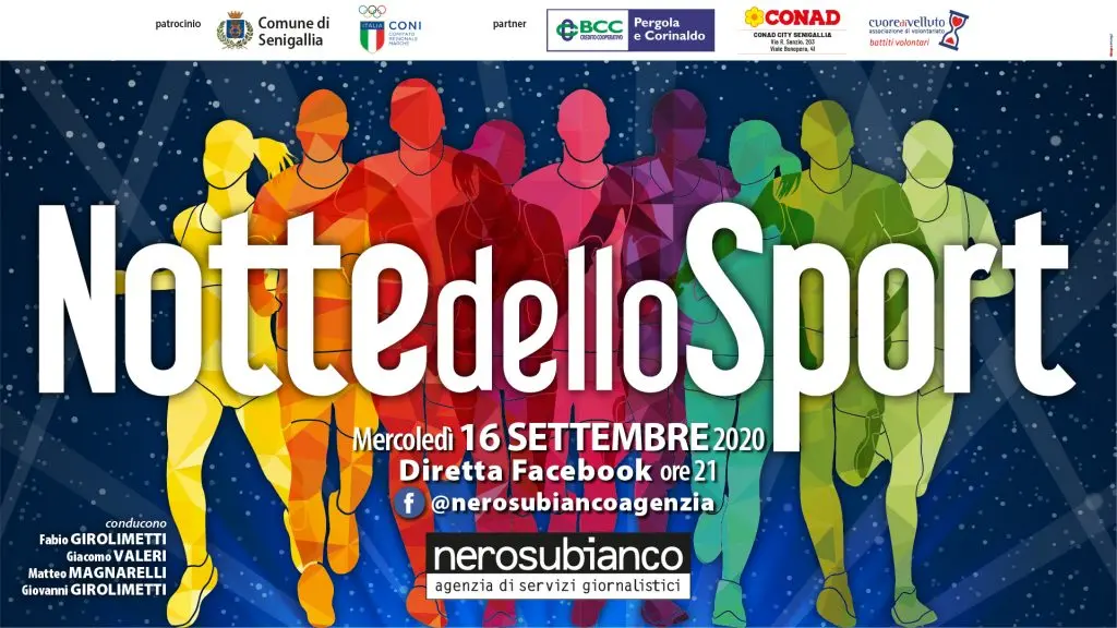 Tutto pronto per la diciottesima edizione della “Notte dello Sport” organizzata dall’agenzia Nerosubianco con il patrocinio di Comune di Senigallia e Coni Marche ed in partnership con Bcc Pergola e Corinaldo, Conad City Senigallia e lo sponsor etico Cuore di Velluto. Per questa edizione dal format del tutto inusuale l’appuntamento è infatti per la diretta Facebook di stasera, che prenderà avvio alle ore 21.00 precise.
